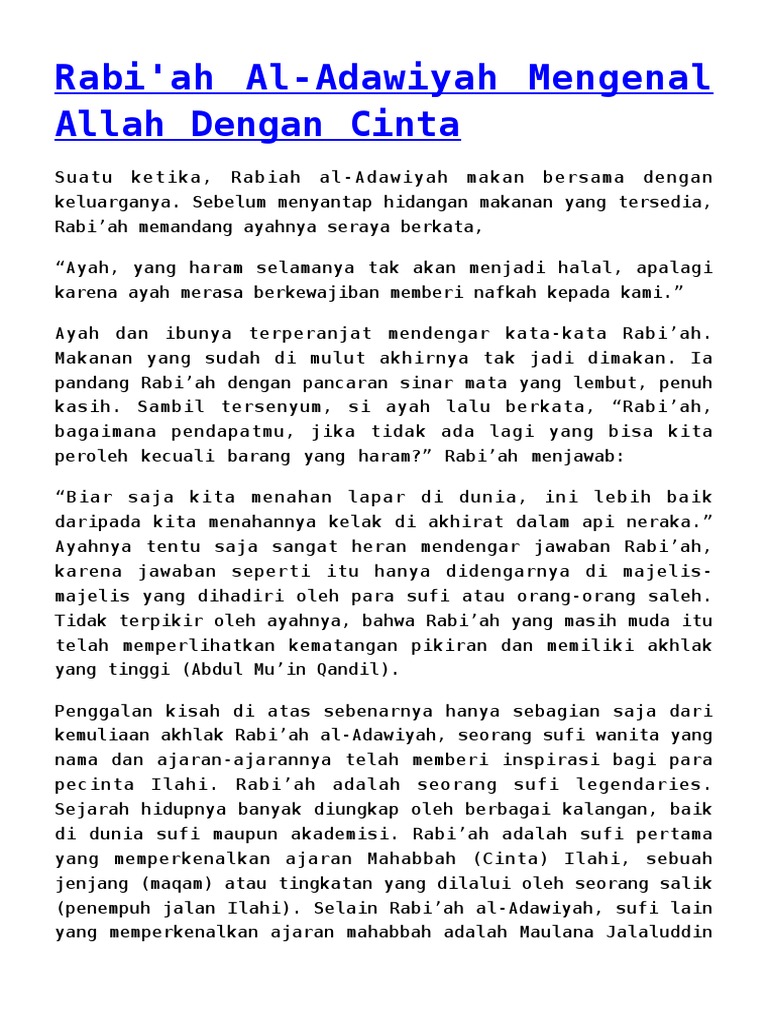 Rabiah al adawiyah terkenal zahid tak tertarik pada harta dan kesenangan duniawi dan tak pernah mau meminta pertolongan pada ornag lain. 0125 risalahati by risalahati published. Manakala kebencian membawa kepada kemusnahan. Rabiah segera mengenakan cadarnya dan mengambil tempat duduk di balik tabir.