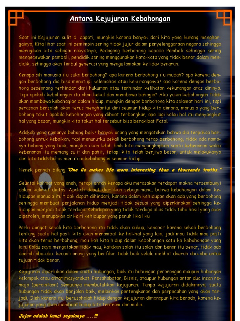 85 ditemukan halaman 6. Kejujuran itu amat mahal apalagi di tengah kehidupan dunia sekarang ini yang dipenuhi kebohongan dan perilaku koruptif. Berkata jujur bisa dilakukan oleh siapa saja. Motivasi hebat orang yang tidak jujur mengungkapkan kesalahannya dari diri mereka sendiri.