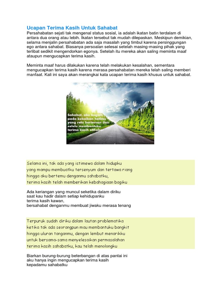 Mungkin bagi orang lain persahabatan kita tak berarti tak berarti tidak apa apa namun bagiku persahabatan sama kamu sebuah anugerah tuhan yang harus di syukuri setiap hari. Kata ucapan terima kasih untuk sahabat sahabat adalah sesosok manusia yang hadir sebagai salah seorang yang berada di samping kita dalam keadaan apapun. Sebenarnya dengan mengucapkan kata terimakasih gambaran karakter orang tersebut bisa diketahui meskipun hanya dengan kata kata kecil yang dianggap sangat sepele. Ibu engkau telah memberikan rasa cinta dan kasih sayang yang tulus untuk saya ibu terima kasih untuk semua yang telah ibu berikan.