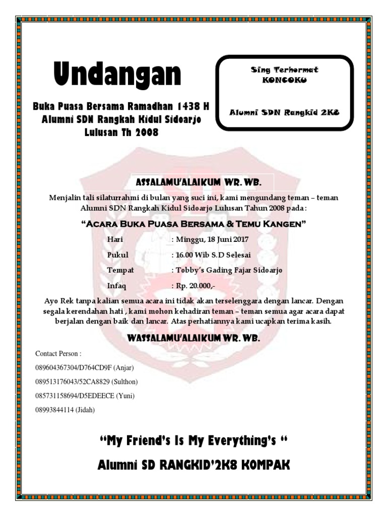 Kata kata undangan bukber. Informasi undangan yang kami bagikan semoga menjadi informasi terbaik dan bisa benrmanfaat untuk semua khususnya informasi tentang kata2 undangan bukber terbaru 2019 yang semuanya kami kumpulkan dengan serapih mungkin. Yu simak di bawah ini beberapa contoh kata kata isi undangan pernikahan. Bayangkan jika anda dikirimi kartu undangan lalu anda membuka dan membaca isinya tapi ternyata susunan kata kata di dalamnya tidak. Informasi undangan yang kami bagikan semoga menjadi informasi terbaik dan bisa benrmanfaat untuk semua khususnya informasi tentang kata kata untuk undangan bukber terbaru 2019 yang semuanya kami kumpulkan dengan serapih mungkin.