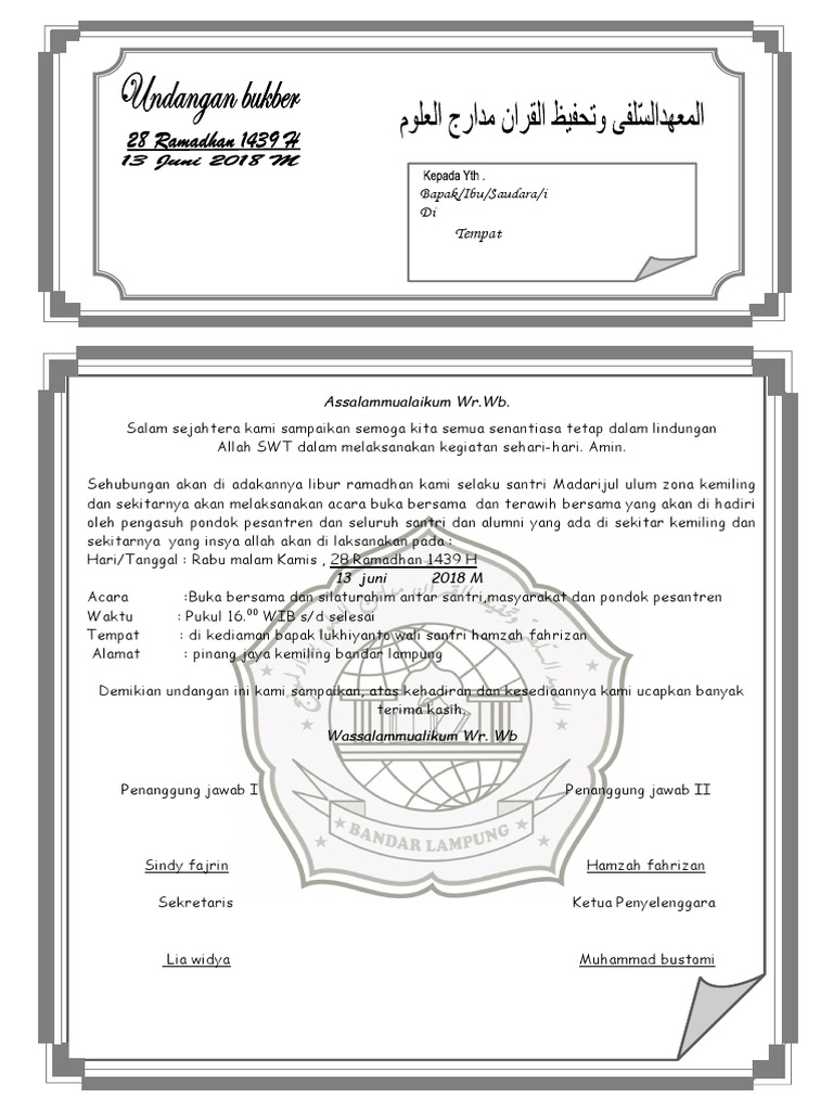 5 contoh undangan buka puasa bersama dalam bahasa inggris beserta arti lengkap bulan ramadhan merupakan sebuah bulan yang istimewa bagi selurug umat islam di dunia karena pada bulan tersebut umat muslim berbondong bondong untuk mengumpulkan pahala dan mengurangi dosa dosa nya. Informasi undangan yang kami bagikan semoga menjadi informasi terbaik dan bisa benrmanfaat untuk semua khususnya informasi tentang kata kata undangan bukber lucu terbaru 2019 yang semuanya kami kumpulkan dengan serapih mungkin. Mohon maaf apabila banyak kesalahan dalam penulisan artikel atau informasi tersebut yang ada kaitannya dengan kata kata. Informasi undangan yang kami bagikan semoga menjadi informasi terbaik dan bisa benrmanfaat untuk semua khususnya informasi tentang kata kata bikin undangan bukber terbaru 2019 yang semuanya kami kumpulkan dengan serapih mungkin.