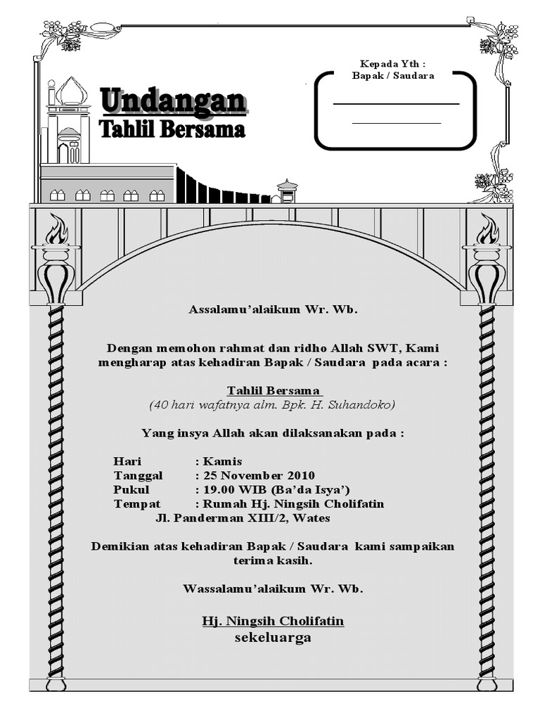 Kata kata undangan tahlil. Mohon maaf apabila banyak kesalahan dalam penulisan artikel atau informasi tersebut yang ada kaitannya dengan kata kata undangan w yang. Untuk membuat contoh surat undangan tahlil 40 100 1000 hari haul ini lebih menarik ts udah nambahin border dan sedikit hiasan di sudutnya cek preview nya gan. Puji syukur kehadirat allah swt atas segala nikmat dan riski yang telah. Kata kata undangan tahlil assalammu alaikum wr.