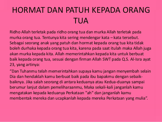 Tidak pantas jika seorang anak membentak kedua orang tuamenuntut dicukupi kebutuhan nya sementara orang tua tak mampu. Banyak yang orang yang ketika sudah sukses merasa tinggi daripada orang lain. Dialah yang rela membanting tulang demi secercah senyum di bibir anak anak nya. Sosok orang tua pasti juga tak bisa hilang dari benak kita semua karena sejak kita lahir hingga sekarang membutuhkan kasih sayang dari orang tua.