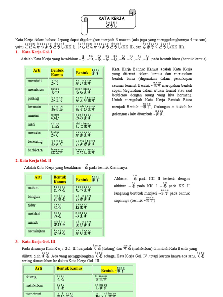 Kata kerja grup 3 ini adalah semua kata kerja yang terbentuk dari kb kata benda surukata suru berarti melakukansehingga akan membentuk kata kerja melakukan aktifitas sesuai dengan kata bendanyauntuk mengubahnya kedalam bentuk halus masu kei. Secara umum kata kerja dalam bahasa jepang dibagi menjadi 3 golongan yaitu. Kemarin kita belajar 14 jenis kata kerja dalam 3 golongan yaitu kelompok i kelompok ii dan irregular kelompok iii. Empat belas jenis kata kerja tersebut sangat penting karena jenis jenis kata kerja inilah mewakili seluruh kata kerja dalam bahasa jepang dan konjugasi perubahan bentuk kata kerja terjadi sesuai dengan 14 jenis kata kerja dalam 3 golongan tersebut.