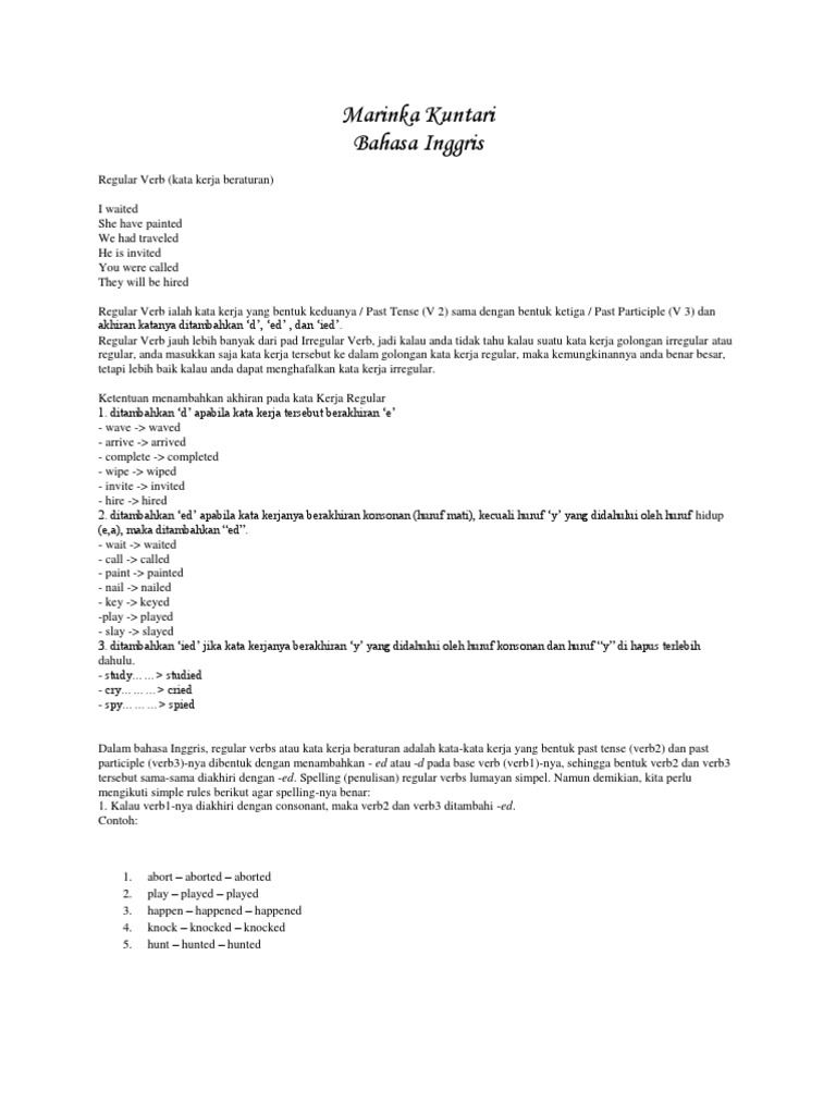 Dari perubahan tersebut maka kita mengenal kata kerja bentuk pertama v1 atau disebut infinitive kata kerja bentuk kedua v2 atau disebut past tense. Daftar irregular verbs irregular verbs merupakan kata kata kerja yang tak beraturan. Regular verb kata kerja beraturan i waited she have painted we had traveled he is invited you were called they will be hired regular verb ialah kata kerja yang bentuk keduanya past tense v 2 sama dengan bentuk ketiga past participle v 3 dan akhiran katanya ditambahkan d ed dan ied. Yang ketiga adalah bentuk irregular verb dimana kata kerja berubah dari verb murninya.