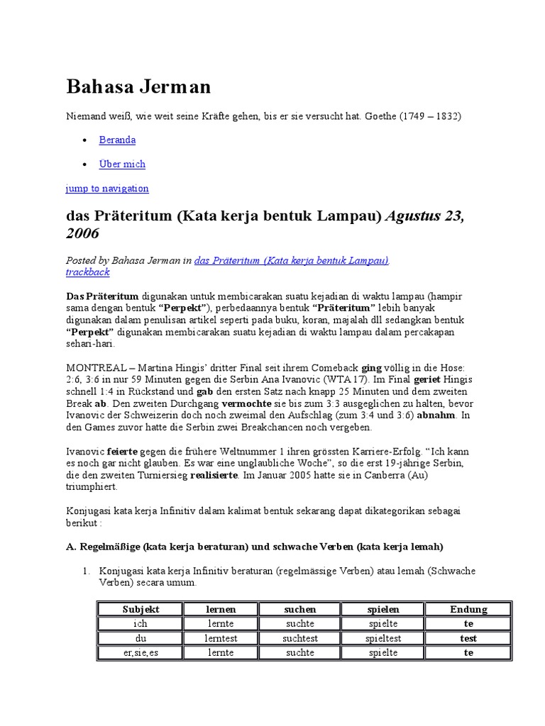 Ingin mampu berkomunikasi dalam bahasa jerman. Apabila anda ingin mencari konjugasi kata kerja dalam bahasa lain selain jerman anda hanya perlu kembali ke halaman utama dari konjugasi verba. Kata apa pun yang mengawali kalimat kata kedua haruslah kata kerja. Hafalkan jumlah kata kerja secara bertahap setiap harinya.
