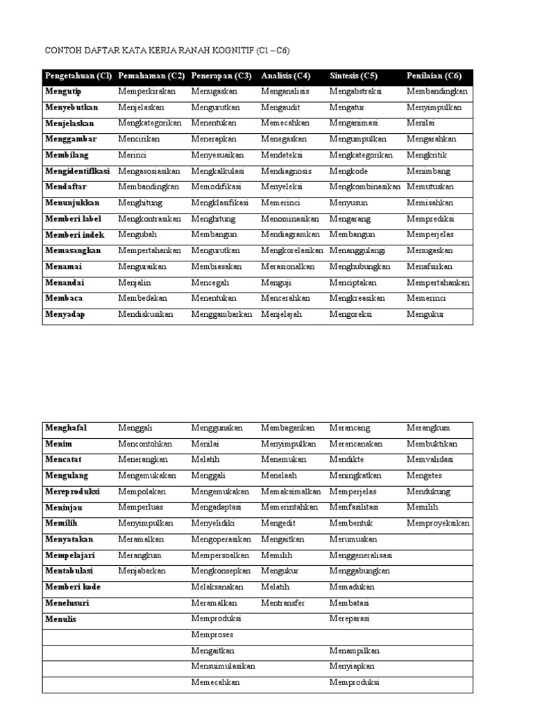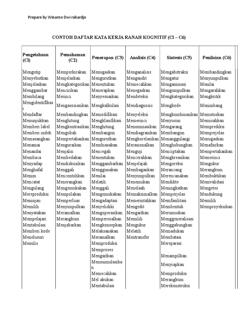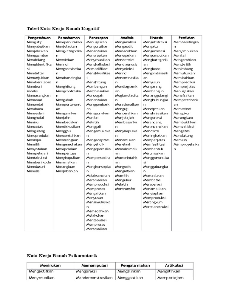 Kata kerja untuk ranah psikomotor p1 p4 adalah kemampuan seseorang untuk merinci atau menguraikan suatu bahan atau keadaan menurut bagian bagian yang lebih kecil dan mampu memahami hubungan di antara bagian bagian atau faktor faktor yang satu dengan faktor faktor lainnya. Smg tidak keliru. Contoh kata kerja ranah kognitif cl c6 pengetahuan cl pemahaman c2 penerapan c3 analisis c4 sintesis c5 penilaian c6 mengutip. Kata kerja ranah kognitif pengetahuan pemahaman penerapan analisis sintesis penilaian mengutip menyebutkan menjelaskan menggambar membilang mengidentifikasi mendaftar menunjukkan memberilabel memberiindeks memasangkan menamai menandai membaca menyadari menghafal meniru mencatat mengulang mereproduksi meninjau memilih menyatakan.