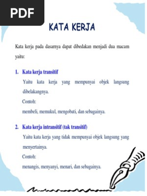 Kata kerja transitif dan intransitif. Kata kerja transitif dan intransitif dalam percakapan sehari hari yang biasa kita ucapkan pada seseorang di dalam kalimat yang kita gunakan tentunya terdapat kata kerja yang mungkin secara tidak sadar atau secara sadar sering kita gunakan. Beberapa bahasa yang mempunyai modus pasif verba transitif dapat dijadikan menjadi verba intransitif. Jika dilihat dari ada tidaknya objek yang mengikuti kata kerja dibagi menjadi kata kerja transitif dan kata kerja intransitifpenggolongan kata kerja tersebut juga berlaku dalam bahasa indonesia. Dalam bahasa inggris kata kerja atau verb dapat dibedakan menjadi 5 macam.