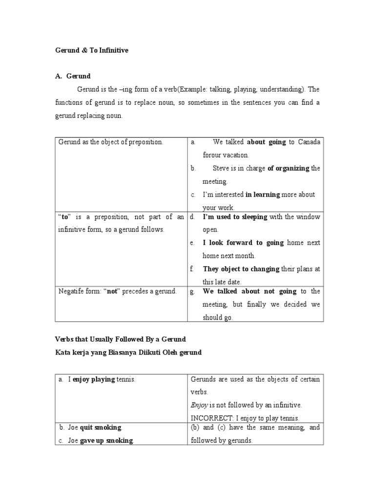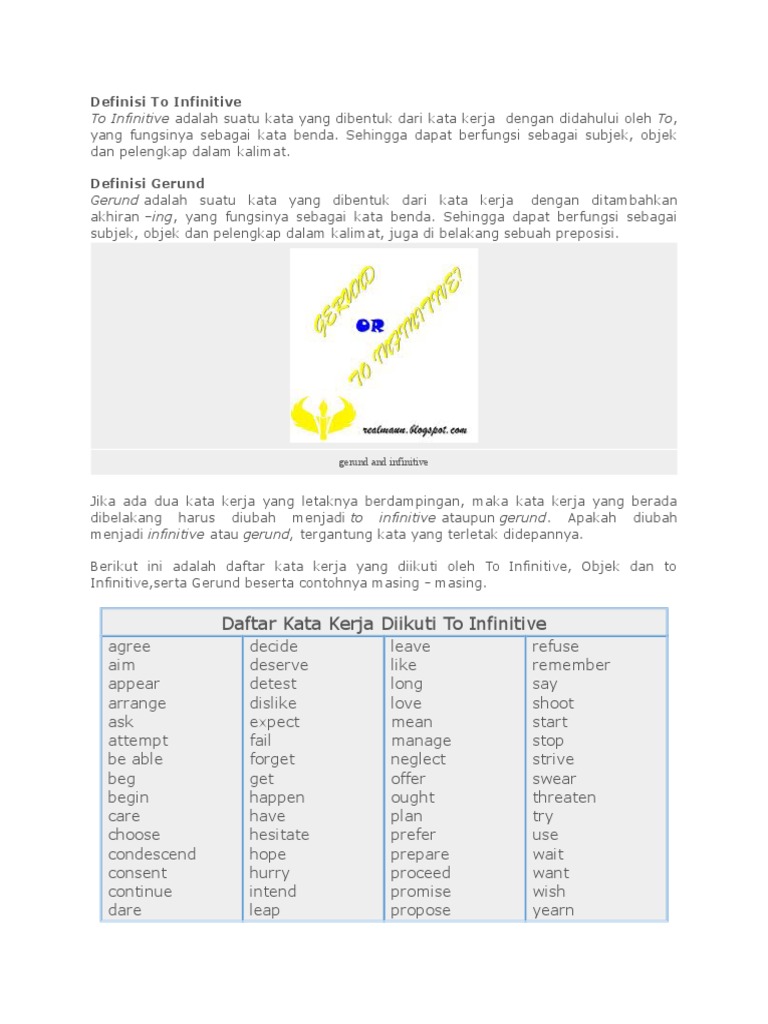 Satu di antara penggunaan gerund adalah sebagai objek setelah kata kerja khusus. Apa saja yang termasuk kata kerja khusus yang harus diikuti gerund. The mayor acknowledges receiving gifts that could be seen as bribes. Khusus pada kesempatan kali ini admin akan memberikan pembahasan singkat dan lengkap mengenai kata kerja yang bisa diikuti saya pernah membuat suatu daftar mengenai kata kerja yang diikuti oleh gerund verbing dan kata kerja yang diikuti oleh infinitive tov1.