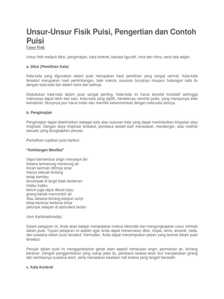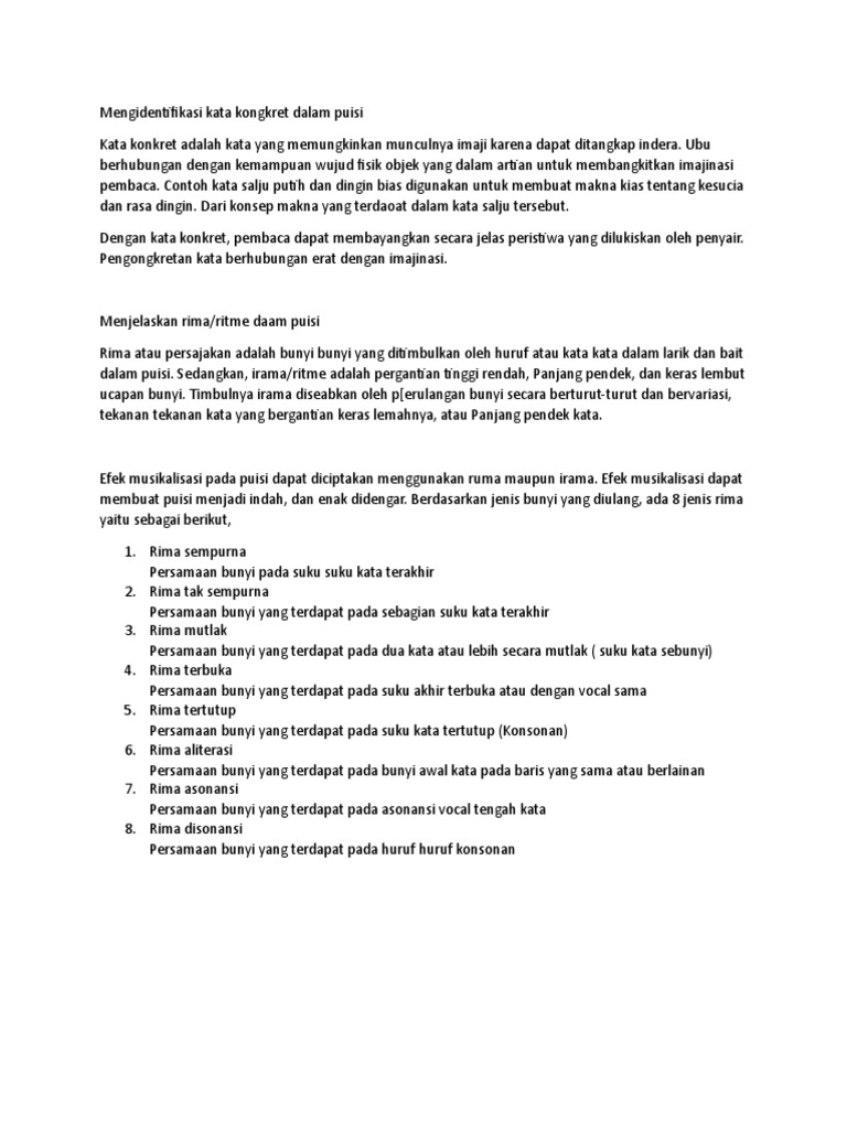 Kata konkret dalam puisi. Pendapat lain tentang kata kata konkret itu sendiri adalah kebalikan dari kata kata abstrak kata kata yang memiliki sifat nyata. Kedua kata ini memiliki dimensi yang berbeda. Berikut ini penjelasan lengkap tentang masing masing kata konkret dalam puisi di atas. Ada ada beberapa kata dalam puisi di atas yang bisa digolongkan dan dijelaskan menjadi kata konkret antara lain.