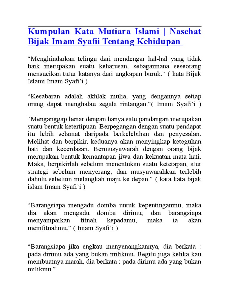 Orang gila he who thinks that he is free from the criticism of people is a madman for even the lord of the worlds himself has been wrongfully criticized. Berikut ini adalah kumpulan kata kata mutiara islami penyejuk hati dan nasehat nasehat bijak dari imam syafii yang patut untuk dijadikan renungan serta motivasi dalam kehidupan. Berikut ini beberapa kata mutiara islam penuh nasehat dari imam syafii yang bisa dijadikan sebagai pengingat serta motivasi diri. Imam syafii merupakan seorang mufti besar sunni islam dan juga pendiri mazhab syafii.