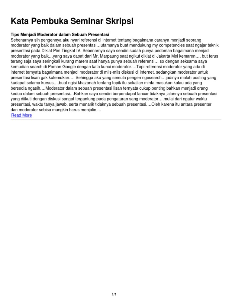 Kata pembuka presentasi seminar proposal. Sidang skripsi merupakan tahapan yang menentukan apakah lulus atau tidakskripsi kita akan diuji oleh beberapa dosen penguji. Membuka presentasi dalam sidang skripsi adalah salah satu tahap yang tidak mudah dilakukan. Dan kita adalah orang yang beruntung karena bisa menyaksikan langsung tentang lamut itu. Semoga seminar ini bermanfaat bagi kita.