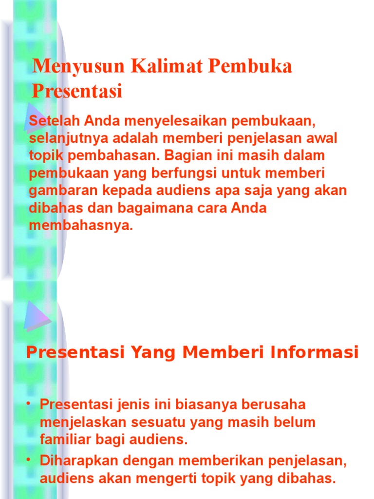 Dale carnegie dalam buku stand and deliver menjelaskan bahwa membuka presentasi adalah bagian terpenting dalam membangun hubungan dengan audiens selama waktu yang akan mereka habiskan dengan mendengarkan. Download 13 slide presentasi keren kelas dunia untuk merevolusi presentasi anda 352040 3 cara agar lancar berbicara di depan umum yang terjamin akan membuat anda tampil percaya diri 311514. Presentasi bahasa inggris menjadi hal yang penting untuk dikuasai. Wb selamat pagi dll.