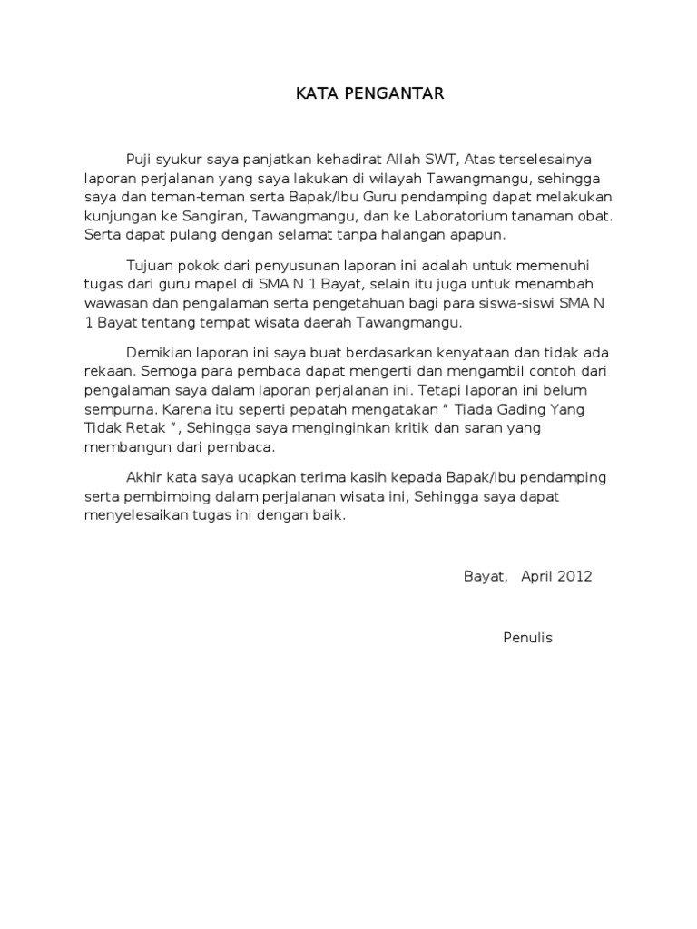 Contoh kata pengantar laporan bagi mahasiswa dan pelajar membuat kata pengantar untuk tugas laporan adalah hal yang sangat penting. Alhamdulillah atas ridho allah swt pelaksanaan study lapangan yang dilaksanakan pada tanggal 12 oktober 2015 telah terlaksana dengan lancar. Adhya tirta batam yang berada di duriangkang dan laboratorium kimia yang. Kata pengantar puji syukur atas kehadirat allah swt.