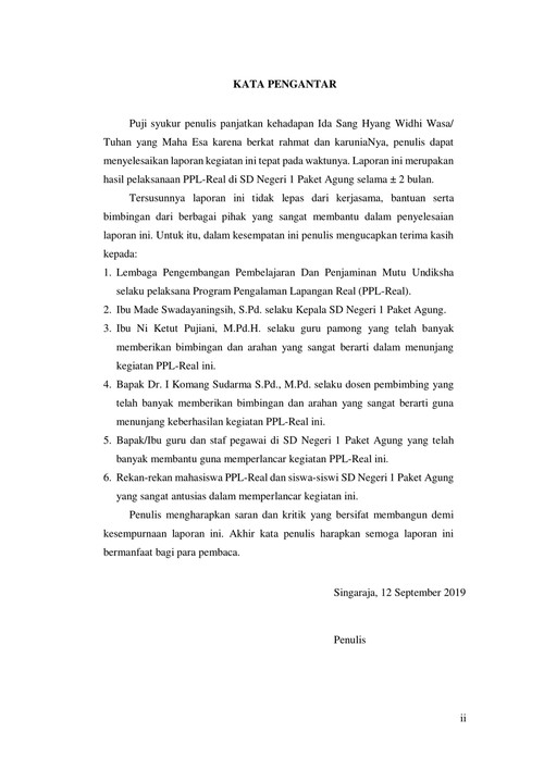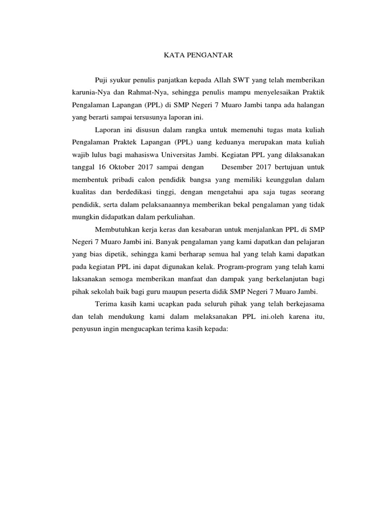 Contoh kata pengantar pkl ppl. Contoh kata pengantar laporan kklkkn kata pengantar puji syukur kami panjatkan kehadiran allah swt karena atas rahmat dan karunianya nya sehingga kegiatan kuliah kerja lapangan nyata kkl kkn ini hingga penyusunan laporan kegiatan kuliah kerja lapangan dapat diselesaikan dengan baik dan tepat pada waktu yang telah ditentukan. Contoh kata pengantar laporan ppl. Kata pengantar laporan ppl kata pengantar.