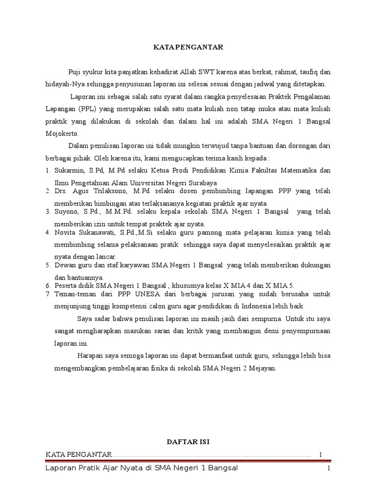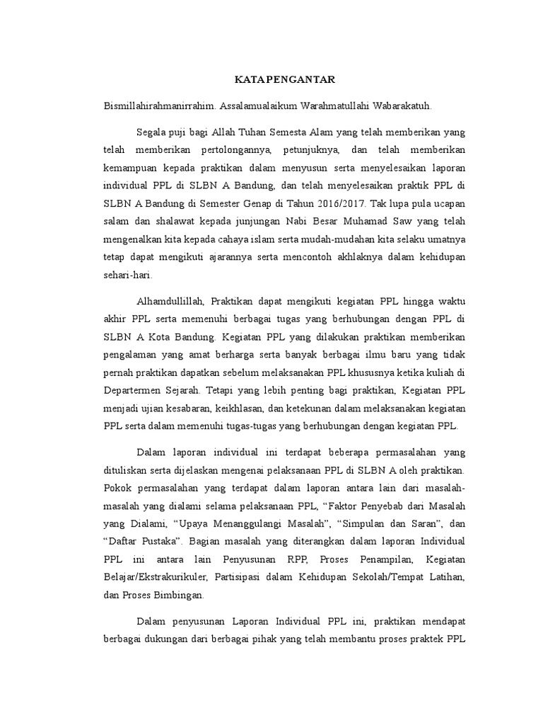 Kata pengantar laporan ppl. Allhamdulillahirobbilalamin puji syukur penulis panjatkan kehadirat allah swt yang senantiasa memberikan nikmat iman ihsan kepada kita serta limpahan rahmat hidayah serta karunianya sehingga penulis dapat menyelesaikan laporan praktek lapangan ppl ini laporan yang wajib dibuat secara. Puji syukur atas kehadirat allah swt yang telah melimpahkan rahmat dan hidayah nya yang telah memberikan bayak kesempatan sehingga kami dapat menyelesaikan laporan pkl dengan baik. Puji dan syukur kami panjatkan kehadirat tuhan yang maha esa atas kasih dan sayang nya sehingga kami dapat melaksanakan kuliah kerja nyata kkn uin malang tahun 2014 di kelurahan dampit kecamatan dampit malang sesuai rencana dan semua program dapat terlaksana dengan lancar. Laporan ini disusun berdasarkan hasil observasi selama ppl di smp yaspih rajeg yang dilaksanakan selama delapan minggu yang dimulai dari tanggal 1 september 30 oktober 2014.