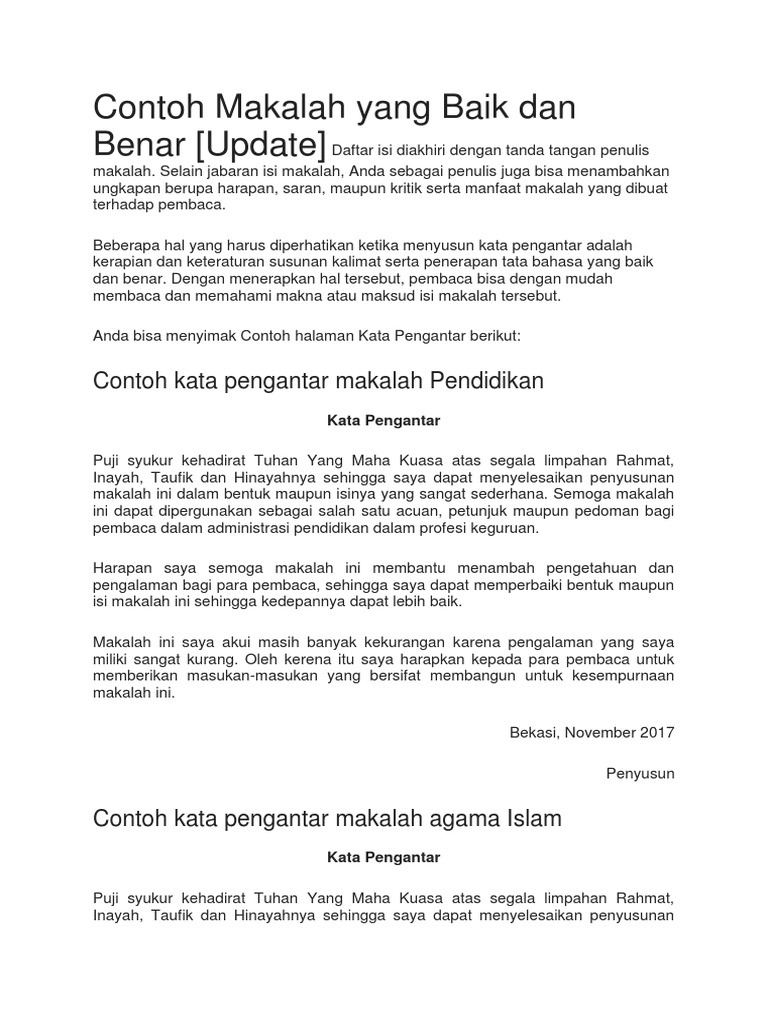 Contoh kata pengantar makalah agama 2 kata pengantar. Makalah ini merupakan tugas mata kuliah pendidikan agama islam di program studi teknik pertambangan fakultas teknik universitas syiah kuala. 34 dalam bukunya gelombang ketiga indonesia mengatakan bahwa para ahli sejarah mencatat ada dua gelombang masuknya islam di nusantara yaitu abad ke 7 dan abad ke 13. Contoh kata pengantar makalah agama 1 kata pengantar dengan menyebut nama allah yang maha pengasih lagi maha penyayang puji syukur kami panjatkan kehadirat allah swt yang telah melimpahkan rahmat hidayah dan inayah nya sehingga kami dapat merampungkan penyusunan makalah pendidikan agama islam dengan judul memahami pengertian dan fungsi perbankan syariah tepat pada waktunya.