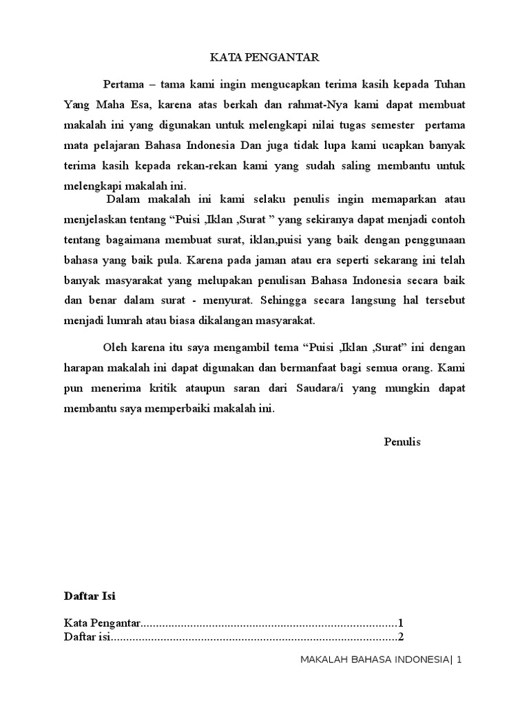 Penggunaan bahasa yang tepat dan dengan menggunakan kata pengantar makalah bahasa indonesia sangatlah diperlukan. Contoh kata pengantar jika anda sering bergelut dengan karya tulis seperti makalah skripsi tesis novel dan lain sebagainya tentunya anda tidak akan asing lagi dengan istilah kata pengantar. Dalam menulis karya tulis kata pengantar merupakan komponen yang paling utama serta tidak boleh anda lewatkan begitu saja.