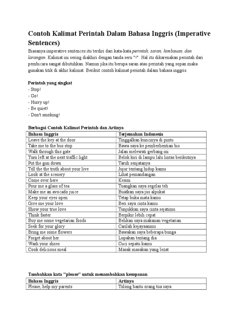 Kata perintah dalam bahasa inggris. Contoh kalimat perintah berisi petunjuk atau arahan. Tambahkan garam ke dalam masakanmu. Pada dasarnya kalimat jenis ini digunakan untuk memberi tahu orang lain apa yang harus dilakukan. Imperative sentence berfungsi untuk memberikan perintah instruksi permintaan nasihat dan peringatan.