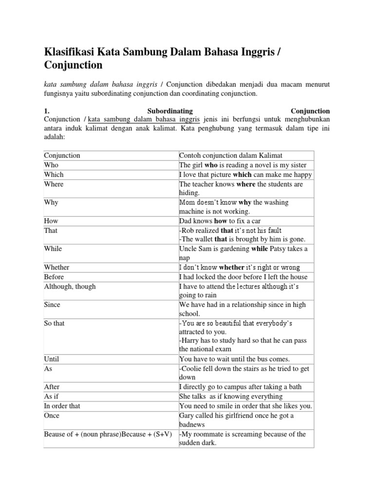 Kata penghubung dalam bahasa inggris conjunction kata penghubung atau kata sambung adalah sebuah kata yang digunakan untuk menghubungkan antara rangkaian kata dengan rangkaian kata lainnya. Yang dimaksud dengan rangkaian kata dapat berupa sebuah kalimat ataupun sebuah frase. Klasifikasi kata sambung dalam bahasa inggris conjunction. Bahasa inggris adalah bahasa yang mudah untuk dipelajaribagaimanapun juga belajar bahasa inggris tidak hanya berkenaan dengan arti kata dan pembendaharaan kata namun harus juga mempelajari struktur kalimat itu sendiri.