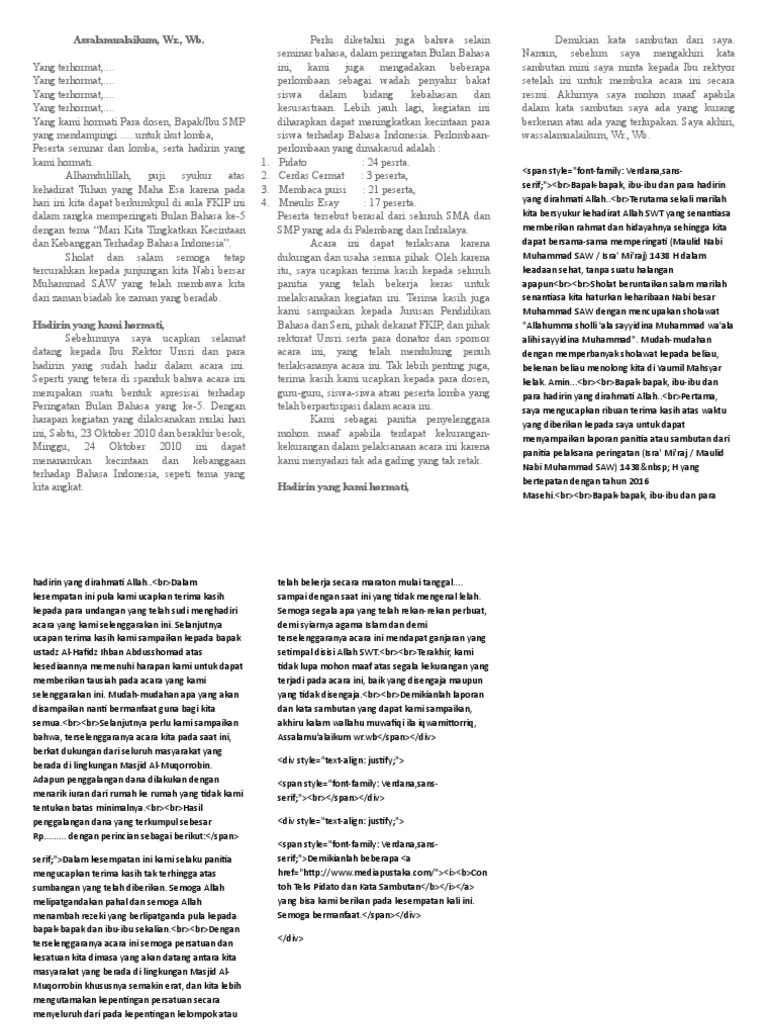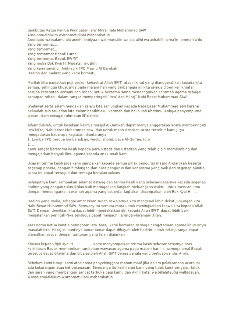 Smk talenta bangsa sukatani 39230 views. Contoh sambutan ketua panitia peringatan isra miraj nabi muhammad saw. Berikut ini adalah kata sambutan dari ketua panitia isra miraj muhammad ibrahim hamdani mahasiswa ilmu politik fisip ui 2005 yang juga anggota kmnu ui yaitu. Atas nama ketua panitia peringatan isra miraj kami berharap semoga pengetahuan agama khususnya masalah isra miraj ini nantinya benar benar dapat dihayati oleh hadirin untuk selanjutanya dapat diamalkan sesuai dengan tuntunan yang telah diajarkan.