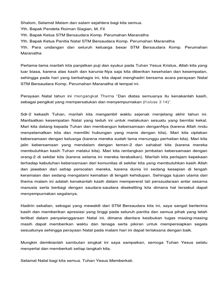 Kata sambutan panitia natal 2019. Akhir kata kami atas nama panitia natal. Contoh sambutan natal 1 shalom bapak ibu saudarai yang saya kasihi di dalam tuhan kita yesus kristus. Semoga info yang kami sampaikan seputar contoh naskah pidato hari natal yang ada diatas bisa menjadi pidato yang bisa anda buat untuk memberikan masukan di hari natal ini.