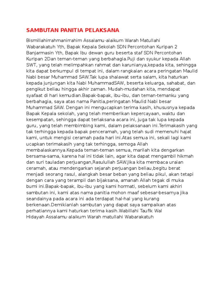 Sambutan ketua panitia peringatan isra miraj nabi muhammad saw. Kami atas nama penyelenggara mohon maaf jika dalam pelaksanaan acara ini ada kekurangan atau ketidakpuasan. Sebelum kami tutup kami atas nama penyelenggara mohon maaf jika dalam pelaksanaan acara ini ada kekurangan atau ketidakpuasan. Semuanya itu kekhilafan kami yang tidak kami sengaja kritik dan saran yang membangun sangat terbuka bagi kami dan akhir kata wa billahitaufiq walhidayah.