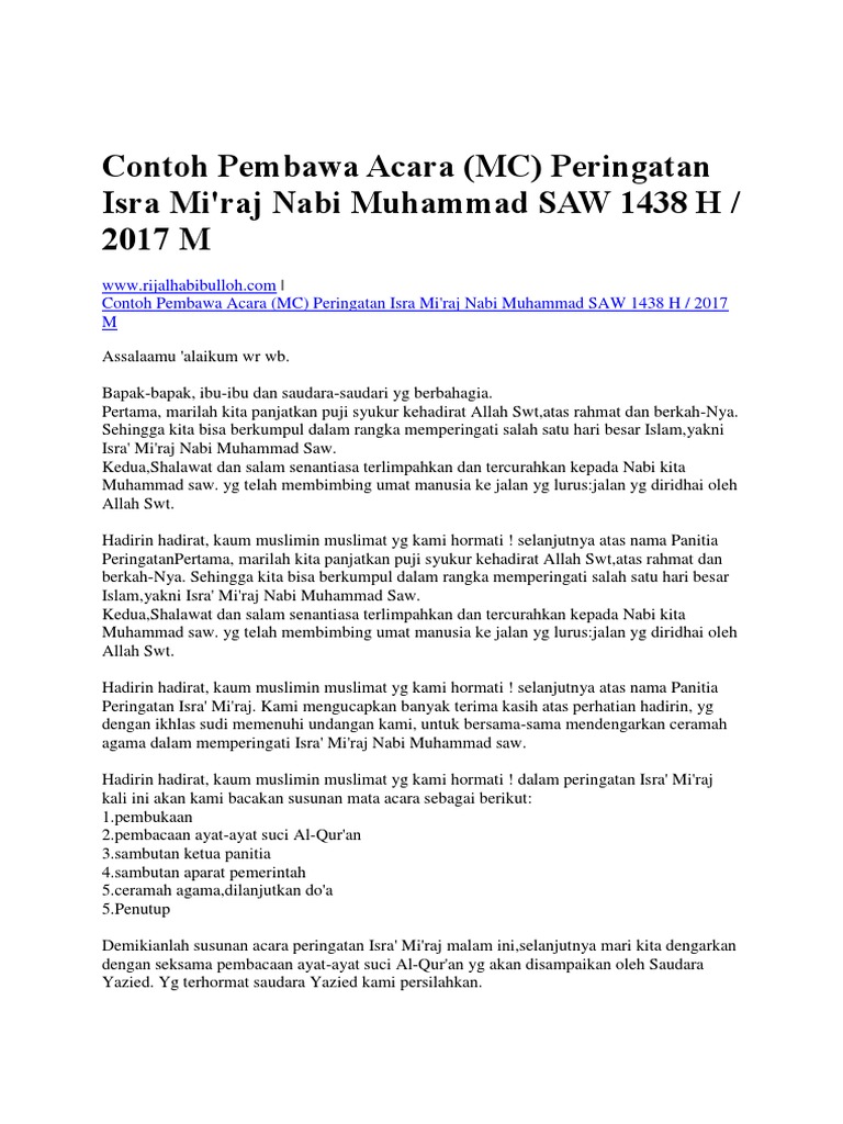 Nah pada kesempatan ini saya akan membagikan sebuah contoh pidato sambutan untuk ketua panitia isra miraj nabi muhammad saw. Berikut ini contoh sambutan ketua panitia isra miraj nabi muhammad saw. Admin blog temukan contoh 2019 juga mengumpulkan gambar gambar lainnya terkait contoh kata sambutan ketua panitia isra mi raj dibawah ini. Atas nama ketua panitia peringatan isra miraj kami berharap semoga pengetahuan agama khususnya masalah isra miraj ini nantinya benar benar dapat dihayati oleh hadirin untuk selanjutanya dapat diamalkan sesuai dengan tuntunan yang telah diajarkan.