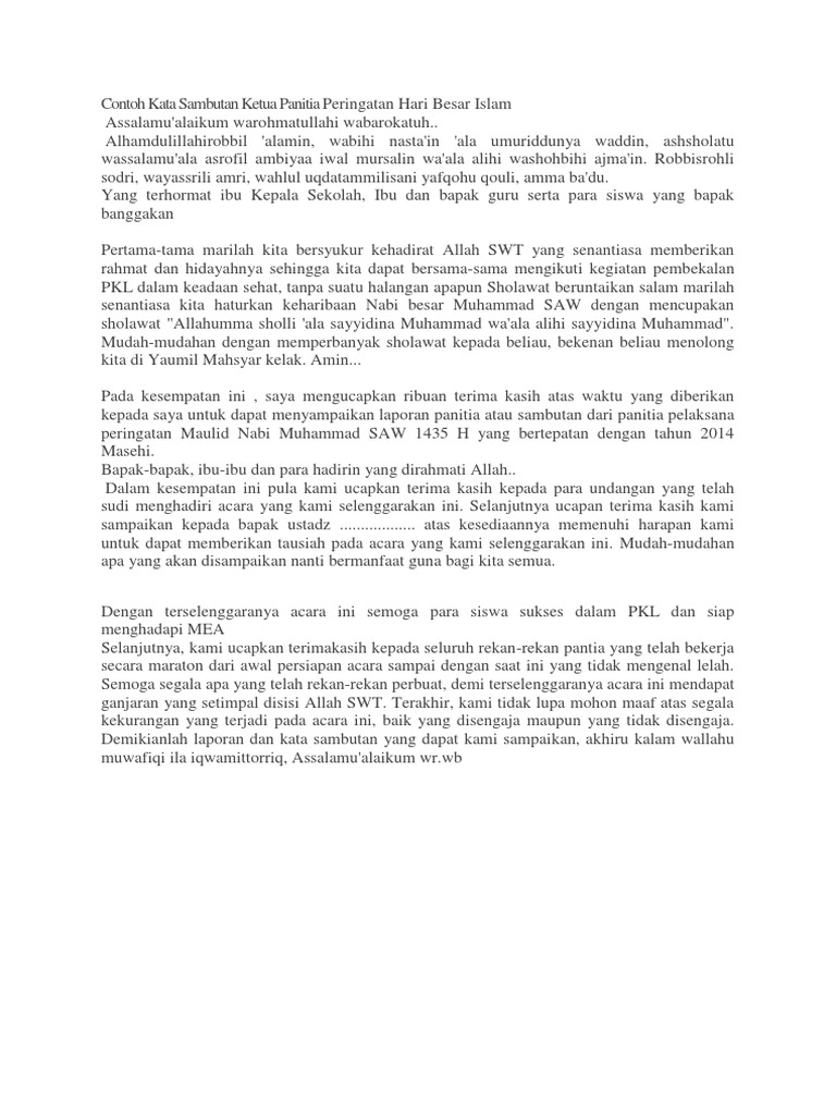 Sambutan ketua panitia kata sambutan merupakan salah satu agenda acara yang hampir selalu ada di setiap acara baik di lembaga formal maupun lembaga non formal pada acara acara yang bersifat formal ataupun nonformal. Kata sambutan adalah suatu kalimat atau kata kata yang. Jadi sebaiknya ketua panitia tidak lupa untuk mengucapkan terima kasih kepada panitia dan anggota. Contoh kata sambutan kita tentunya sudah pernah menghadiri suatu acara baik itu formal atau nonformal nah dalam suatu acara tersebut banyak sekali kita lihat kata sambutan yang biasanya disampaikan oleh tokoh penting dalam suatu acara tersebut misalkan acara perpisahan sekolah biasanya akan ada kata sambutan dari kepala sekolah.