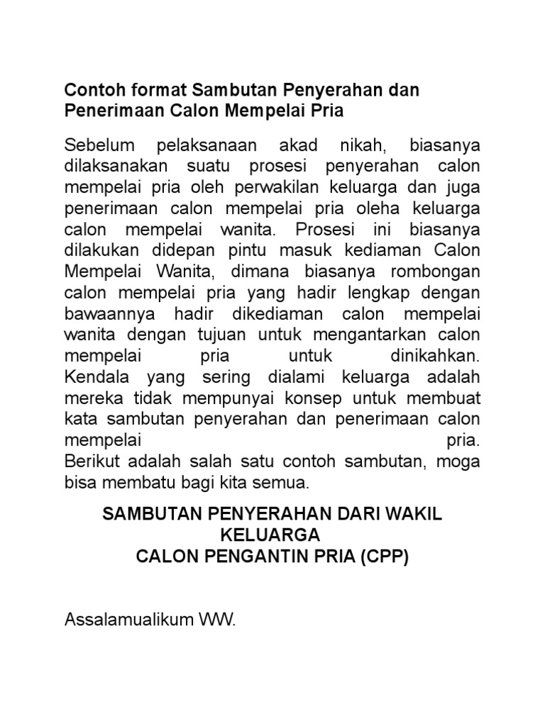 Kata sambutan resepsi pernikahan dari mempelai wanita. Kata sambutan ini biasanya pula menjadi sarana untuk menyampaikan nasehat untuk kedua mempelai dan menjadi sarana untuk menyampaikan bahwa mempelai laki laki tersebut sudah menjadi bagian dari keluarga mempelai wanita. Saya rasa cukup sekian kata sambutan dari saya atas nama bapak nama ayah mempelai wanita sekeluarga kami mohon maaf jika ada sesuatu yang kurang berkenan dalam acara resepsi siang hari ini. Resepsi pernikahan yang digelar antara mempelai wanita mt 21 dengan mempelai pria mtr 24 di desa baringeng kecamatan lilirilau pada selasa 962020 ini awalnya berjalan lancar. Namun warga yang datang sebagai tamu undangan menaruh curiga akan perawakan mempelai pria yang mirip wanita.