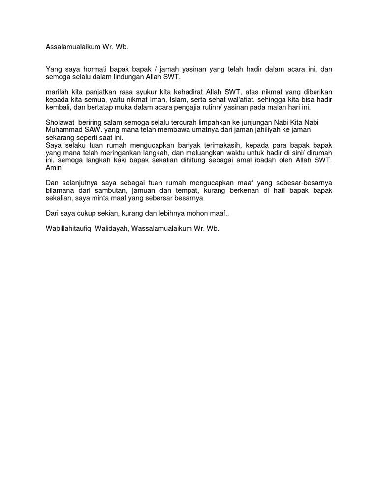 Dilihat dari waktu ke waktu penggunaan bahasa jawa masih sangatlah kurang di kalangan para pemuda kebanyakan hanya orang orang tua lah yang sudah mengerti dan masih menggunakannya. Teks sambutan tuan rumah bahasa jawa alhamdulillah alhamdulilah irrobilalamin a sollatu wassalammuala asro f il am b yai walmursalin syaidina muhammadin wangala alihi wasohbihi ajemangin amabadhu. Sambutan tuan rumah dalam masyarakat jawa pada umumnya memakai bahasa jawa. Contoh kata sambutan tuan rumah yang islami contoh kata sambutan ketua panitia.