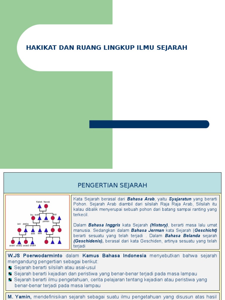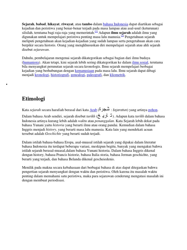 ἱστορία historia artinya mengusut pengetahuan yang diperoleh melalui penelitian adalah kajian tentang masa lampau khususnya bagaimana kaitannya dengan manusiadalam bahasa indonesia sejarah babad hikayat riwayat atau tambo dapat diartikan sebagai kejadian dan peristiwa yang benar benar terjadi pada masa lampau atau asal usul keturunan silsilah. Adapun kata tarikh dalam bahasa indonesia artinya kurang lebih adalah waktu atau penanggalankata sejarah lebih dekat pada bahasa yunani yaitu historia yang berarti ilmu atau orang pandai. Sanskerta merupakan bahasa liturgis dalam agama hindu buddha dan ajaran jainisme serta salah satu dari 23 bahasa resmi di india. Sejarah dalam bahasa jerman yaitu geschichte yang berarti sudah terjadi.