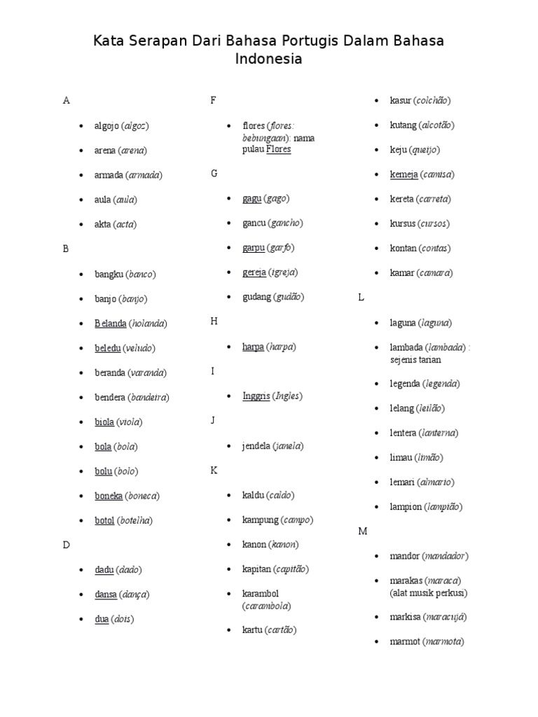 Kata serapan bahasa portugis. Bahasa indonesia tidak hanya mencakup kata kata asli melainkan juga memuat kata serapan dari bahasa. Portugis dikecundangi atas saingan dengan belanda yang datang kemudian dan menyingkir ke daerah timur nusantara. Portugis dikecundangi atas saingan dengan belanda yang datang kemudian dan menyingkir ke daerah timur nusantara.