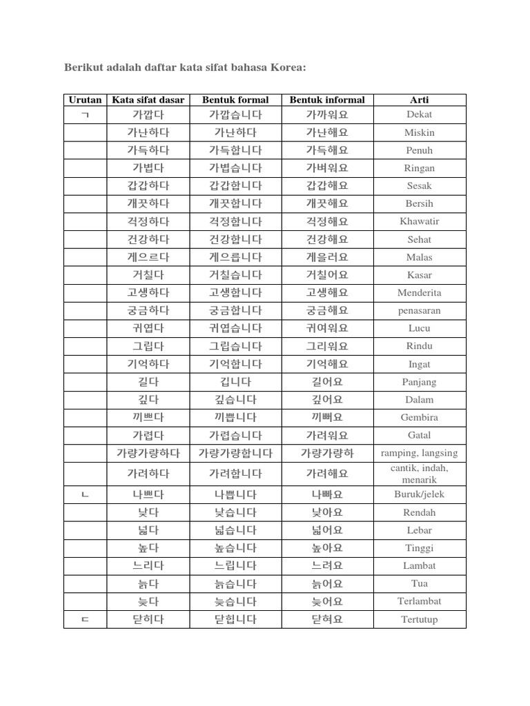 Kata sifat bahasa korea. Coba liat kata kata di bawah ini. Untuk memahami bahasa korea dengan lebih baik kalian harus bisa memahami dan menghafal sebanyak banyaknya kata sifat dalam bahasa korea. Cara menulis dan membaca hangul pola kalimat percakapan dan terjemahan. Nah mungkin kalian yang sudah punya kamus bahasa korea akan banyak kata kata yang keluar dengan akhiran 다data.