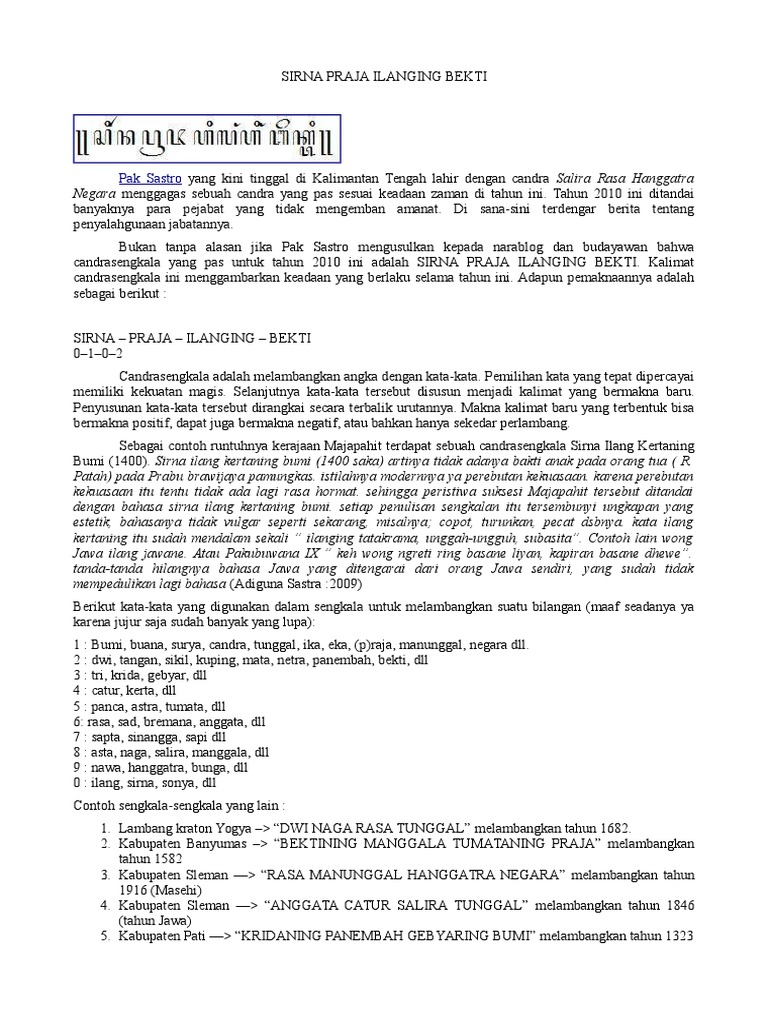 Kata sirna ilang kertaning bumi berasal dari. Sengkalan sirna ilang kertaning bumi dimaksudkan pengarang babad tanah jawi untuk menggambarkan runtuhnyahilangnya kerajaan majapahit pada tahun 1400 caka atau. Sebelumnya juga sudah didiskusikan didalam comment bahwa arti dari sengkalan ini mungkin juga tidak. Saat majapahit sirna ilang kertaning bhumi orang amerika tengah menyebut maja dengan maya sebagian pembesar dan keluarga kerajaan majapahit diceritakan melarikan diri kemudian muksa. Kata sirna sendiri berarti lenyap ilang berarti hilang kerta dapat diartikan sebagai kemakmuran bumi berarti dunia.