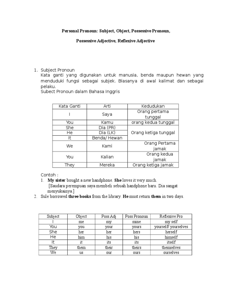 Kata subjek bahasa inggris. Subject merupakan bentuk pelaku ataupun ataupun penyebab dari suatu hal terjadi. Subjek dapat berupa noun kata benda noun phrase frase kata benda atau pronoun kata ganti. The dog barked anjing. Ada 3 kelompokkan kata ganti dalam bahasa inggris yakni kata ganti orang kata ganti kepemilikan dan kata ganti penegasan.