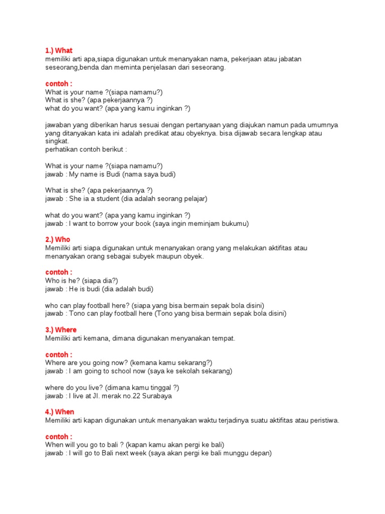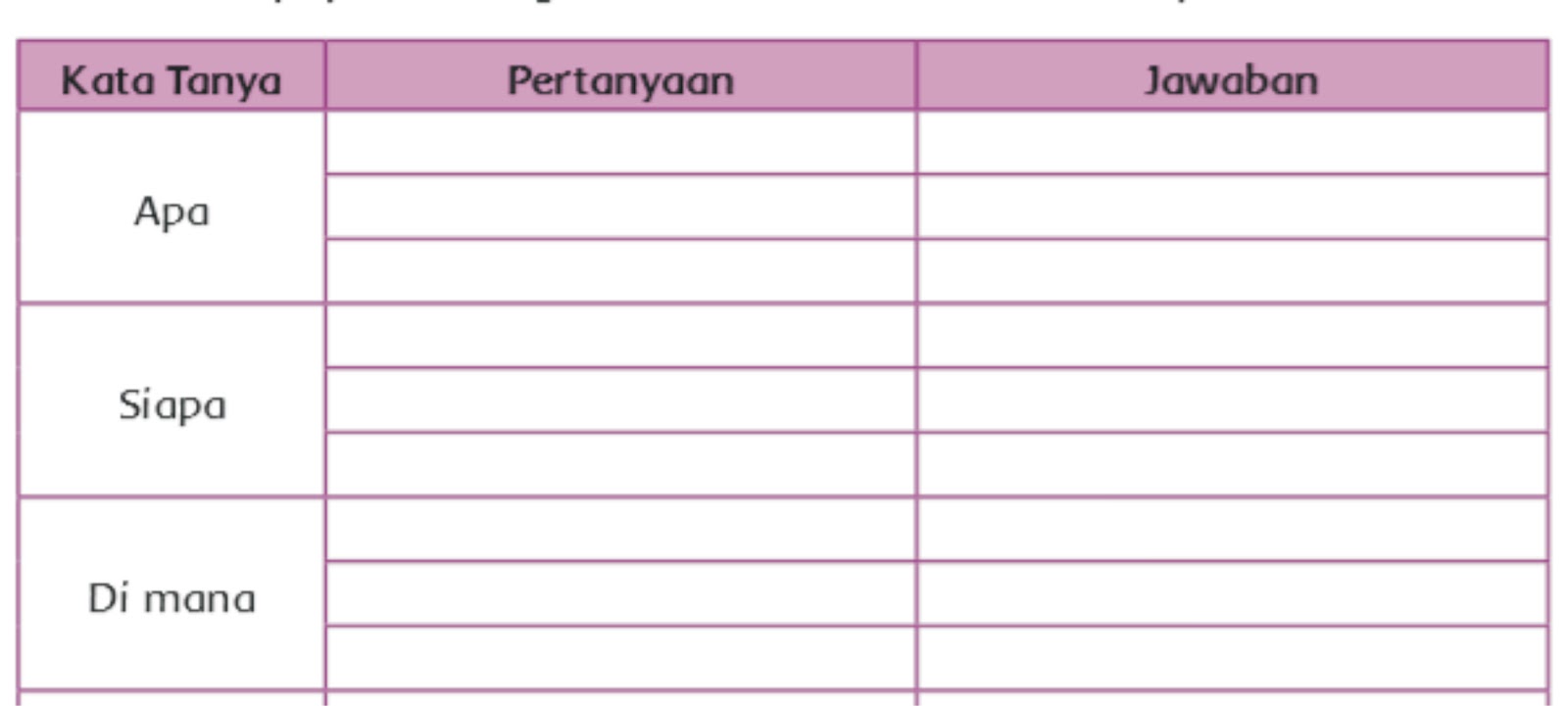 Kata tanya pertanyaan jawaban. Adapun jawaban untuk kata tanya ini adalah suatu pengertian keterangan ataupun penjelasan dari apa yang ditanyakan. Ingat jawaban pasti dapat ditemukan pada bacaan yang disajikan. Jika anda pernah mengenal 8w dan 1h dalam bahasa inggris untuk bertanya. Oleh karena itu kata tanya ini lazim disebut 8w 1h.