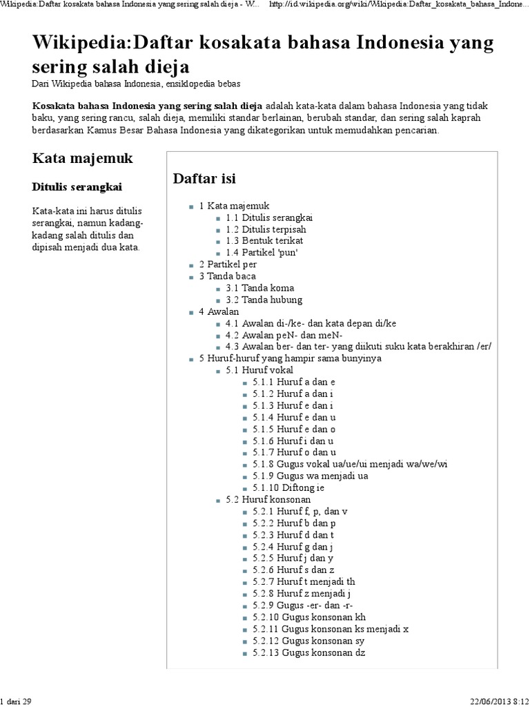 Kosa kata bahasa indonesia yang baku. Perlu diketahui ketentuan ini tidak berlaku apabila katafrasa di bawah ini digunakan. Kosakata bahasa indonesia yang sering salah dieja adalah kata kata dalam bahasa indonesia yang tidak baku yang sering rancu salah dieja memiliki standar berlainan berubah standar dan sering salah kaprah berdasarkan kamus besar bahasa indonesia kbbi yang dikategorikan untuk memudahkan pencarian. Kosakata bahasa indonesia sehari hari yang salah kosakata vocabulary dalam bahasa inggris adalah pembendaharaan kata yang kemudian digunakan untuk menyusun kalimat baru. Mohamad yamin salah seorang deklarator sumpah pemuda berpendapat bahwa bahasa menunjukkan bangsa sehingga tiada bahasa hilanglah bangsa itu.