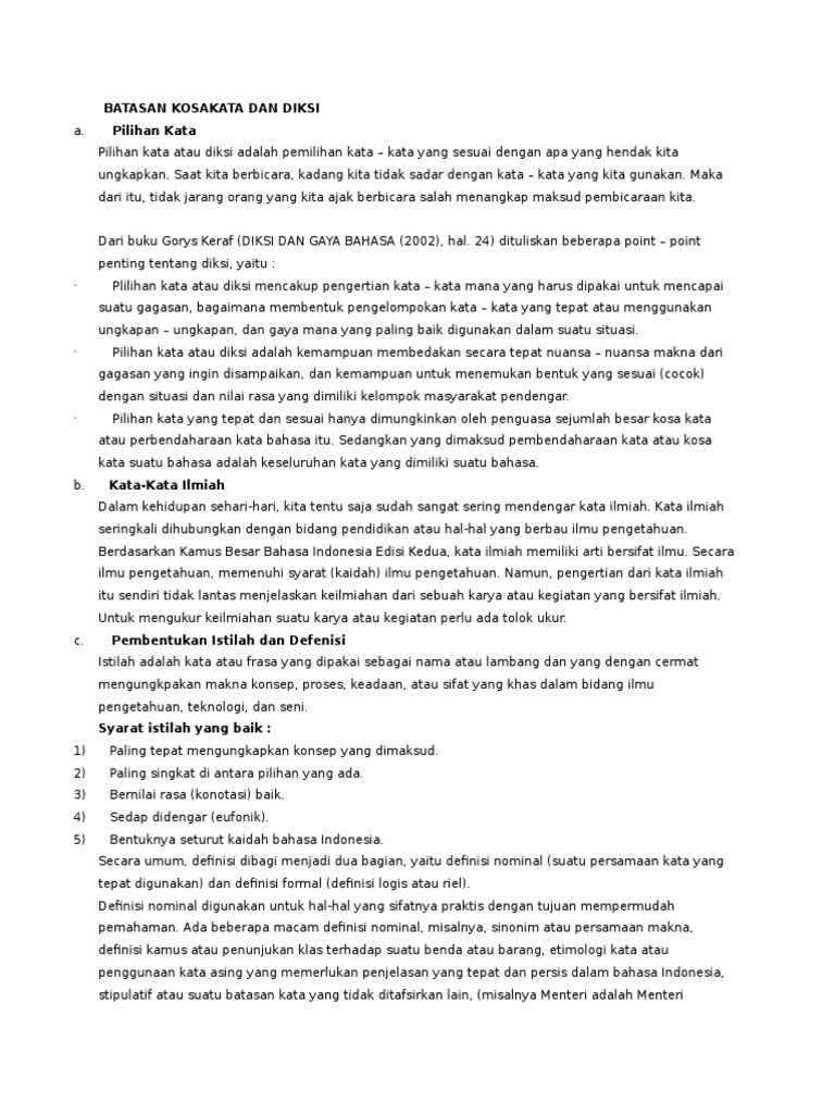 Kosa kata dan diksi. Pengertian diksi adalah suatu pilihan kata yang tepat dan selaras dengan penggunaannya dalam menyampaikan sebuah gagasan atau cerita yang meliputi gaya bahasa ungkapan pilihan kata dan lain lain sehingga didapatkan efek sesuai dengan yang diinginkan. Batasan kosa kata dan diksi 1pilihan kata pilihan kata atau diksi adalah pemilihan kata kata yang sesuai dengan apa yang hendak kita ungkapkan. Saat kita berbicara kadang kita tidak sadar dengan kata kata yang kita gunakan. Khusus untuk etimologi kata kita harus mengartikan suatu kata asing sesuai dengan asal kata asingnya.