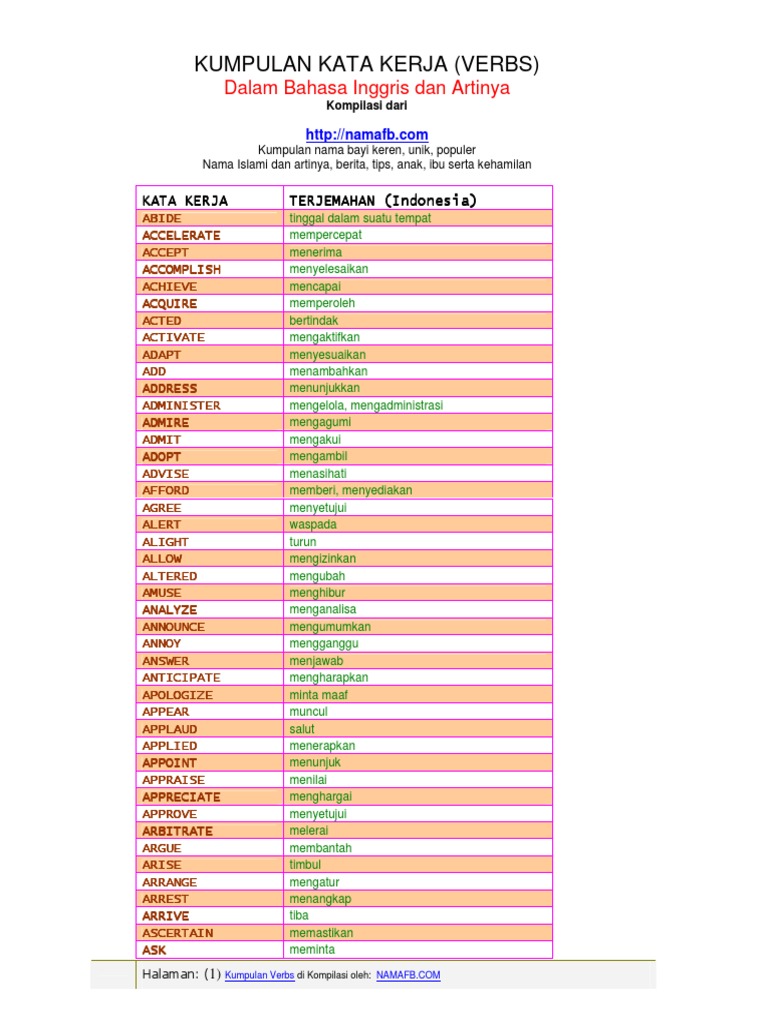 Kumpulan kata kerja bahasa inggris. Kata kerja tersebut berubah tergantung dari penggunaannya. Dalam belajar bahasa inggris memahami dan menghapal kosakata kata kerja sangat penting karena kata kata kerja. Kata kerja dalam bahasa inggris atau verb adalah salah satu elemen yang merupakan kegiatan tindakan atau perbuatan dari subjek. Oh ya untuk mengetahui arti suatu kata kerja gampang yaitu dengan mengeceknya di google translate atau kamus yang anda miliki.