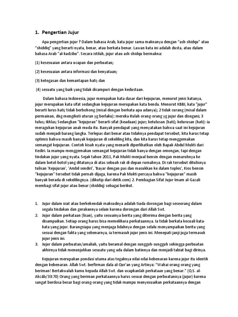1 kesesuaian antara ucapan dan perbuatan. Dalam bahasa arab kata jujur semakna dengan as sidqu atau siddiq yang berarti benar nyata atau berkata benar.