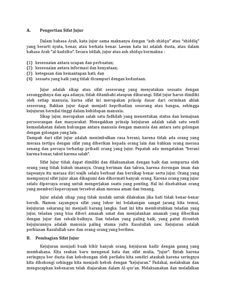 2 kesesuaian antara informasi dan kenyataan. Kata sifat bahasa arab adalah kata benda isim yang yang berfungsi untuk memberikan sifatnaat terhadap benda lain atau memberikan keterangan khobar. Lawan kata ini adalah dusta atau dalam bahasa arab al kazibusecara istilah jujur atau as sidqu bermakna. Dan 4 sesuatu yang baik yang tidak dicampuri kedustaan.