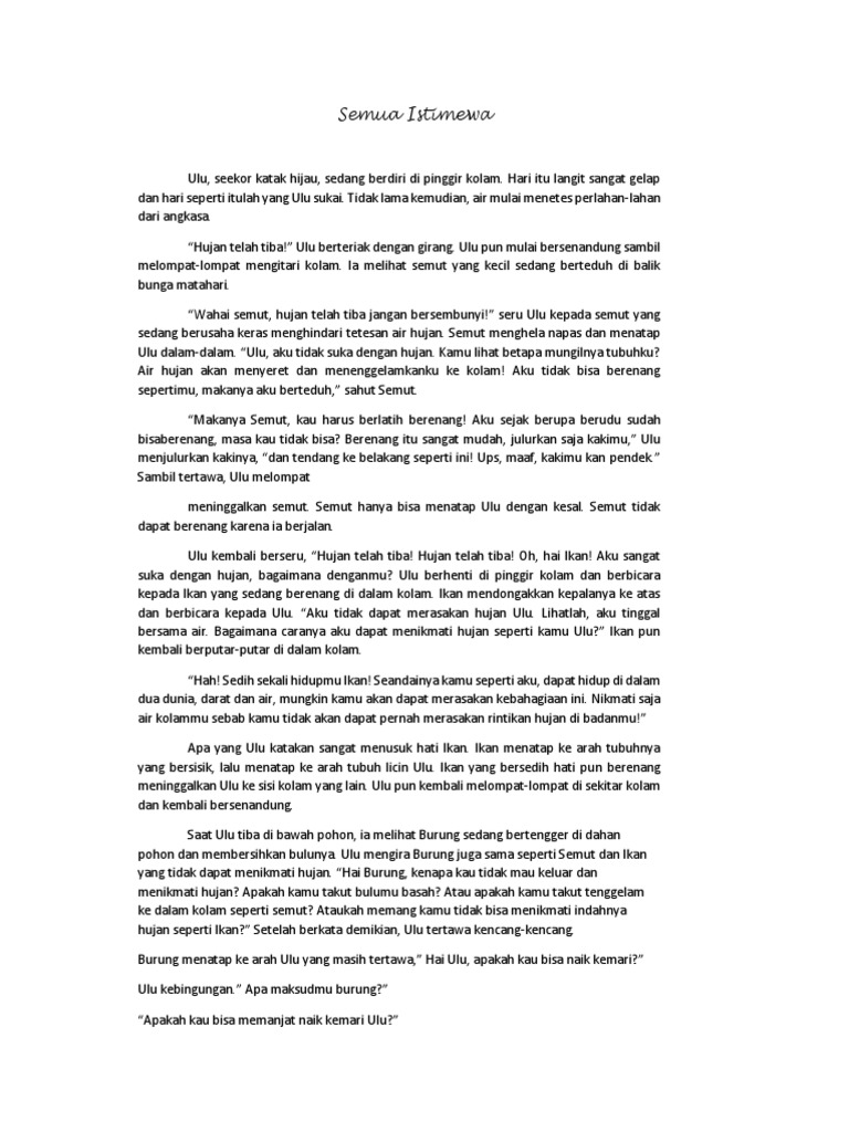 Berenang itu sangat mudah julurkan saja kakimu ulu menjulurkan kakinya dan tendang ke belakang seperti iti. Makanya semut kau harus berlatih berenang. Hujan telah tiba d. Semut hanya bisa menatap ulu dengan kesal.