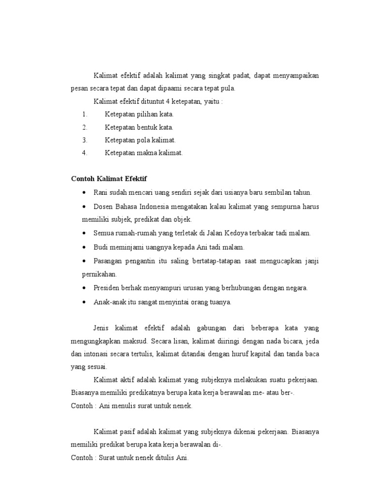 Dalam kalimat efektif anda tidak boleh melakukan kesalahan dalam pembentukan kata dan juga penggunaan kata. Efektif di pahami sebagai sebuah kalimat yang dapat membantu menjelaskan sesuatu persoalan secara lebih singkat jelas padat dan mudah di mengerti serta di artikan. Jenis kalimat efektif adalah gabungan dari beberapa kata yang mengungkapkan maksud. Yaitu jenis kalimat yang dapat memberikan efek tertentu dalam komunikasi.