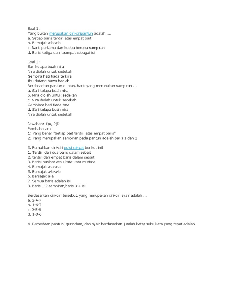Mempelajari dunia pendidikan salah satunya ciri dari rima secara utuh adalah dengan pengulangan huruf vokal yang sebagian besar diulang. Soal berada pada halaman 170adapun jawaban soal tersebut adalah jawaban alternatif dari admin yang diperuntukan sebagai bahan evaluasi adik adik setelah mengerjakan soal tersebut sendiri namun sekiranya adik adik agar lebih paham soal menemukan.