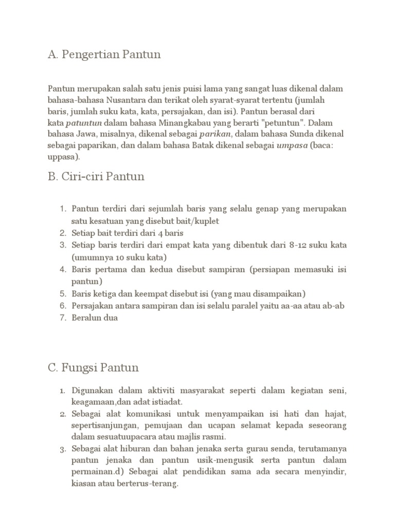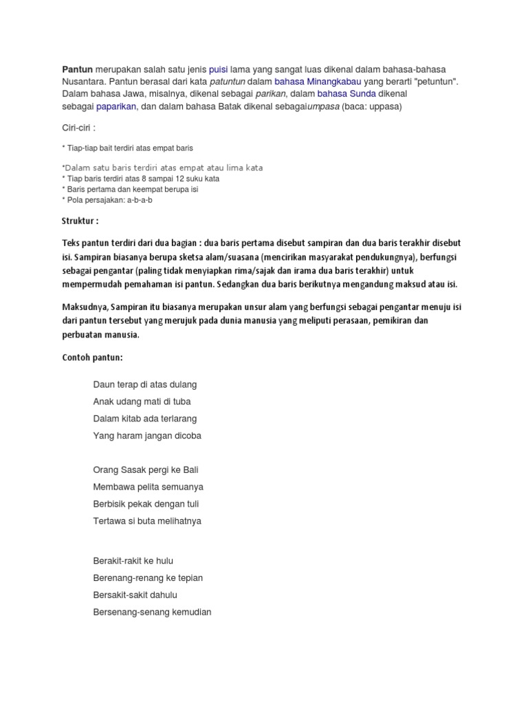 Pantun berasal dari kata patuntun dalam bahasa minangkabau yang berarti petuntundi berbagai daerah di indonesia pantun disebut. Dalam bahasa sunda disebut paparikan. Di jawa pantun disebut parikan dalam bahasa sunda dikenal dengan paparikan sedangkan dalam bahasa batak disebut dengan umpasa. Antologi pantun yang pertama itu berjudul perhimpunan pantun pantun melayu.