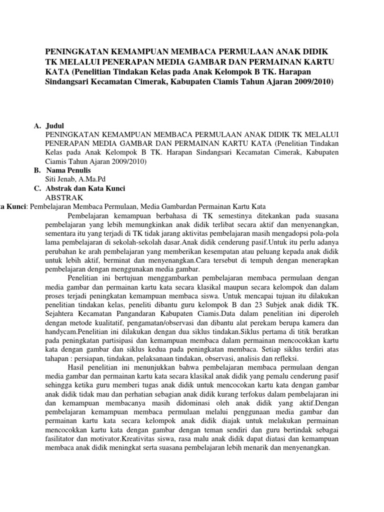 Esny baroroh nim 13111241004 abstrak penelitian ini bertujuan untuk meningkatkan kemampuan membaca permulaan anak menggunakan media kartu kata bergambar pada kelompok b di. Peningkatan kemampuan membaca permulaan melalui media kartu kata bergambar pada anak kelompok b2 ra maarif nu karang tengah kertanegara purbalingga skripsi diajukan kepada fakultas ilmu pendidikan universitas negeri yogyakarta untuk memenuhi sebagian pesyaratan guna memperoleh gelar sarjana pendidikan oleh ari musodah nim 10111244004. Abstrak permasalahan dalam penelitian ini adalah rendahnya kemampuan membaca permulaan siswa pada pembelajaran bahasa indonesia di kelas i sd inpres 1 kamarora. Kemampuan bahasa membaca kartu gambar.