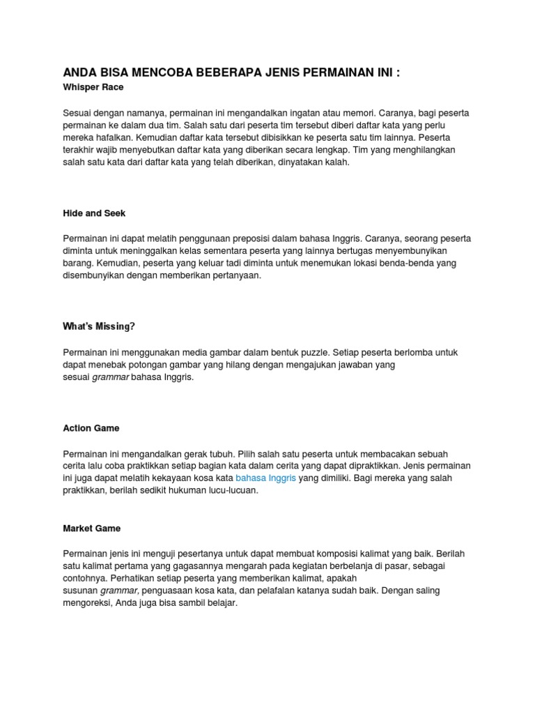 5 5 upvotes mark this document as useful 4 4 downvotes mark this document as not useful embed. Sama seperti contoh tebak kata diatas cobalah bagi teman teman menjadi dua kelompok. Permainan ini dimainkan dengan memeragakan kata atau frasa yang tertulis di secarik kertas. Carousel previous carousel next.
