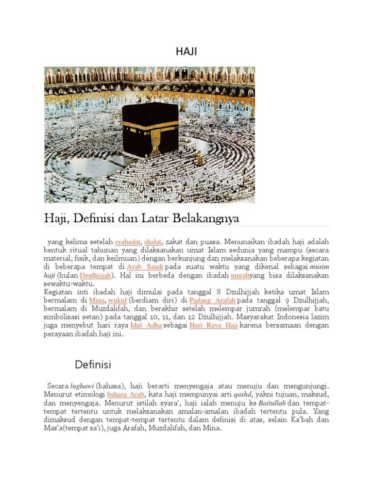 Melaksanakan ibadah haji adalah bentuk ritual ibadah tahunan yang dilaksanakan oleh umat islam dari seluruh dunia yang mampu secara materi fisik dan keilmuan dengan berkunjung dan melaksanakan beberapa kegiatan di beberapa tempat di arab saudi pada suatu waktu yang dikenal. Dalam bahasa arab akidah berasal dari kata al aqdu العقد yang berarti ikatan at tautsiiqu التوثيق yang berarti kepercayaan atau keyakinan yang kuat al ihkaamu الإحكام yang artinya mengokohkan menetapkan dan ar rabthu biquw wah الربط بقوة yang berarti mengikat dengan kuat. Temat tempat tertentu yang dimaksud dalam definisi di atas yakni tidak hanya kabah masa area sai pun padang arafah area wukuf muzdalifah ruangan mabit mina lokasi melontar.