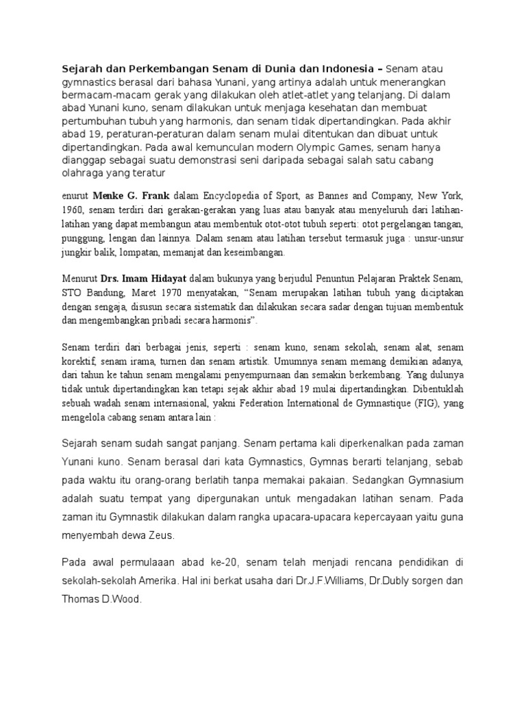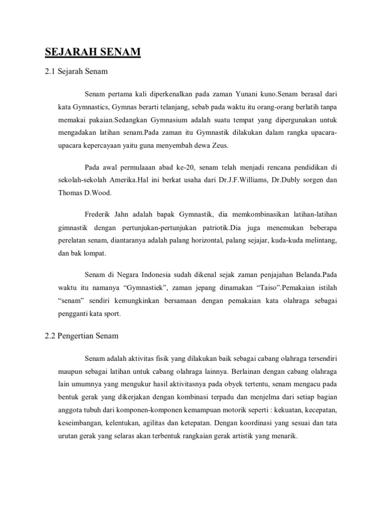 Pengertian dan sejarah senam bagian i senam berasal dari bahasa inggris disebut gymnastic yang berasal dari kata gymnos melakukan latihan senam di ruangan khusus yang disebut gymnasium atau gymnasion. Gymnastics sendiri berasal dari kata serapan bahasa yunani yaitu gymnos yang berarti telanjang. Orang yunani kuno melakukan latihan senam di ruangan khusus yang disebut gymnasiumatau gymnasion. Gymnos ini artinya telanjang hal ini karena atlet atlet pada zaman dahulu berlatih tanpa memakai pakaian.